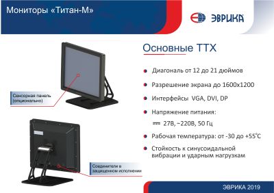 Специализированные жидкокристаллические мониторы (СЖКМ) серии «Титан-М» предназначены для эксплуатации в широком диапазоне внешних воздействующих факторов, в условиях круглосуточной или сменной работы с перерывами на техническое обслуживание в соответствии с руководством по эксплуатации на конкретную модификацию монитора.